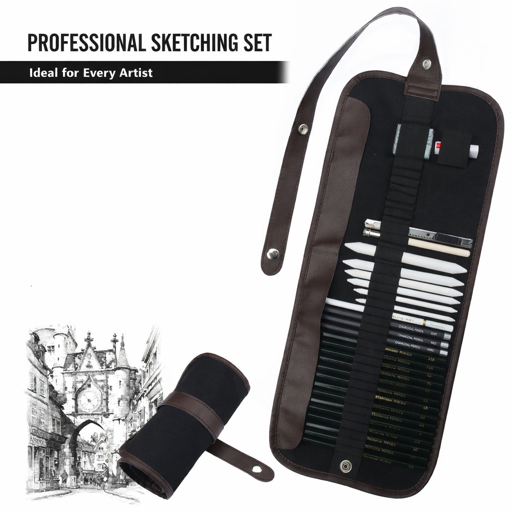 This complete sketching set is designed for beginners, students, and professional artists. Packed in a stylish roll-up case, it’s perfect for studio and outdoor sketching.
