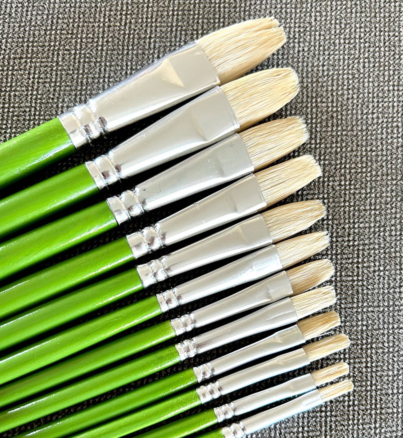 A versatile 12-piece brush set made with natural hog bristles. Durable, strong and perfect for acrylic and oil painting. The stiff bristles hold paint well and create beautiful texture on canvas.